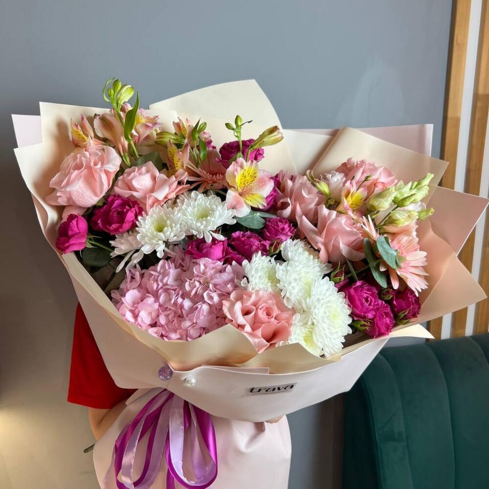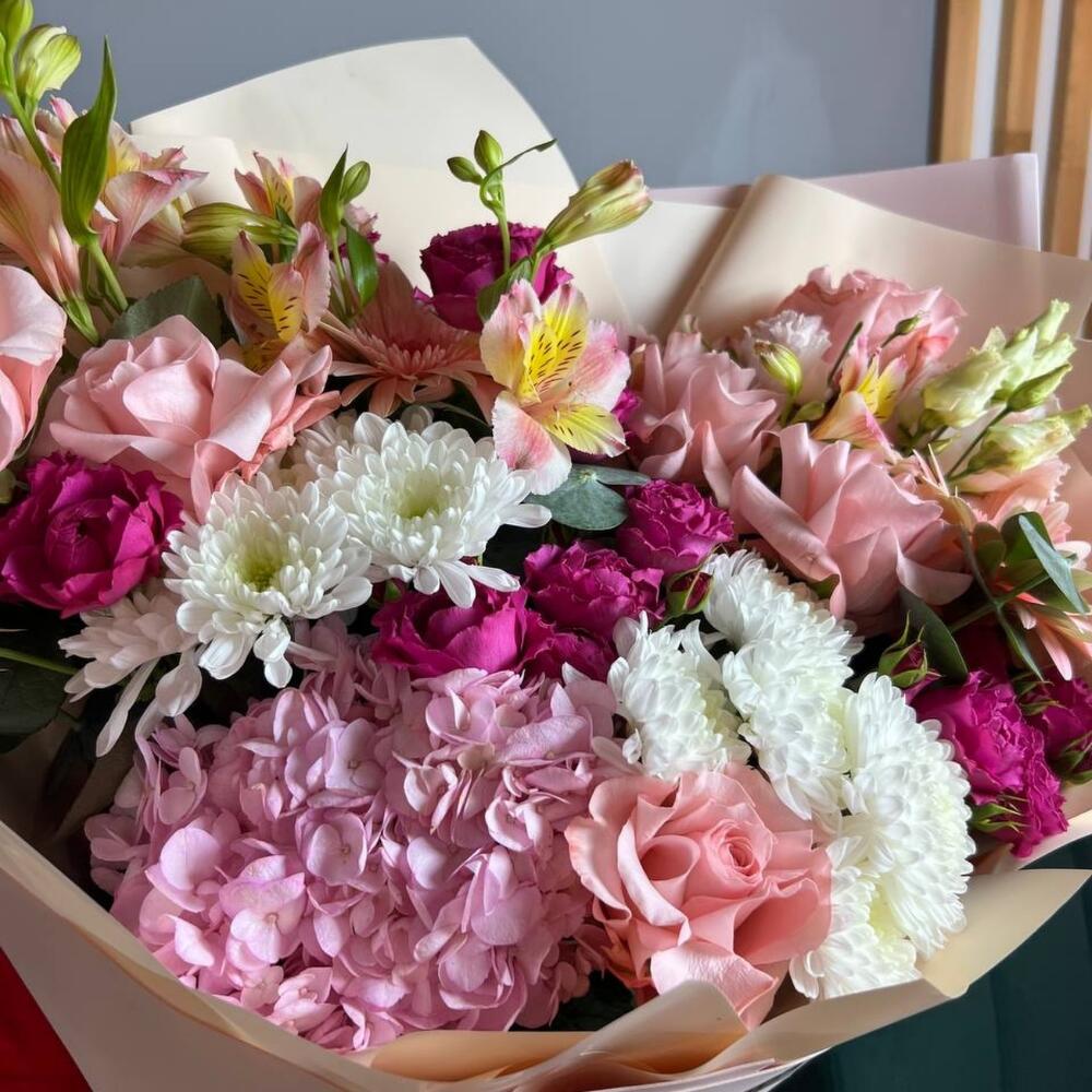 Роскошный букет из гортензии, французских роз с эустомой, герберой и хризантемой. Этот шикарный букет идеально подойдёт в качестве извинений для жены или девушки. Ни одна женщина перед таким не устоит.